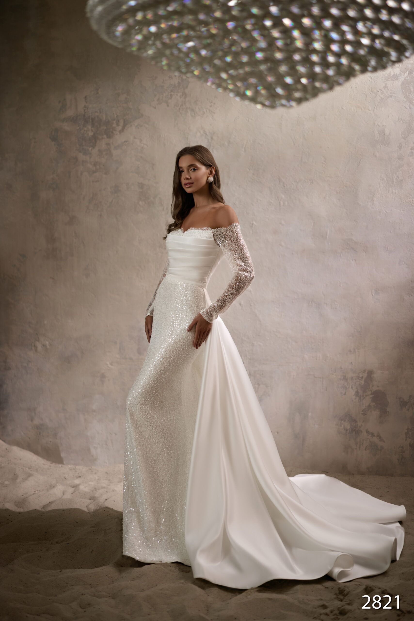A dazzling off-the-shoulder wedding gown that combines shimmering sequins with delicate lace sleeves for a touch of glamour. The structured bodice and flowing train create a dramatic yet refined silhouette, perfect for a bride seeking elegance with a modern flair.