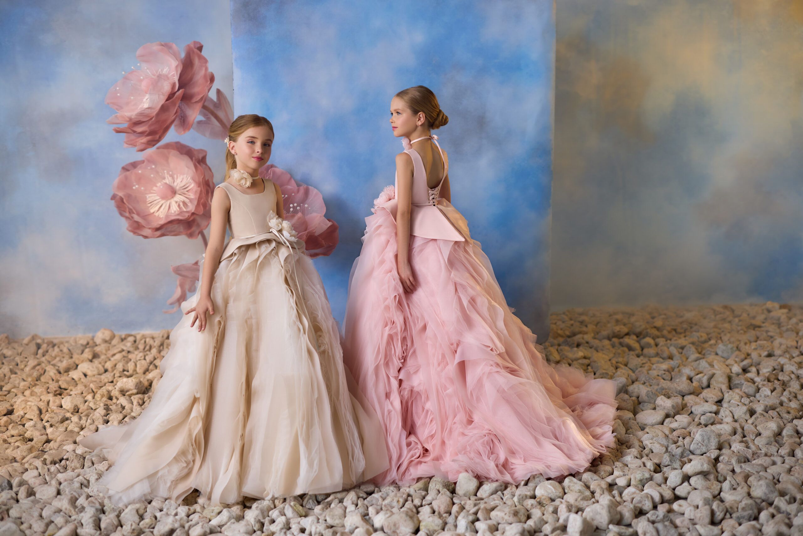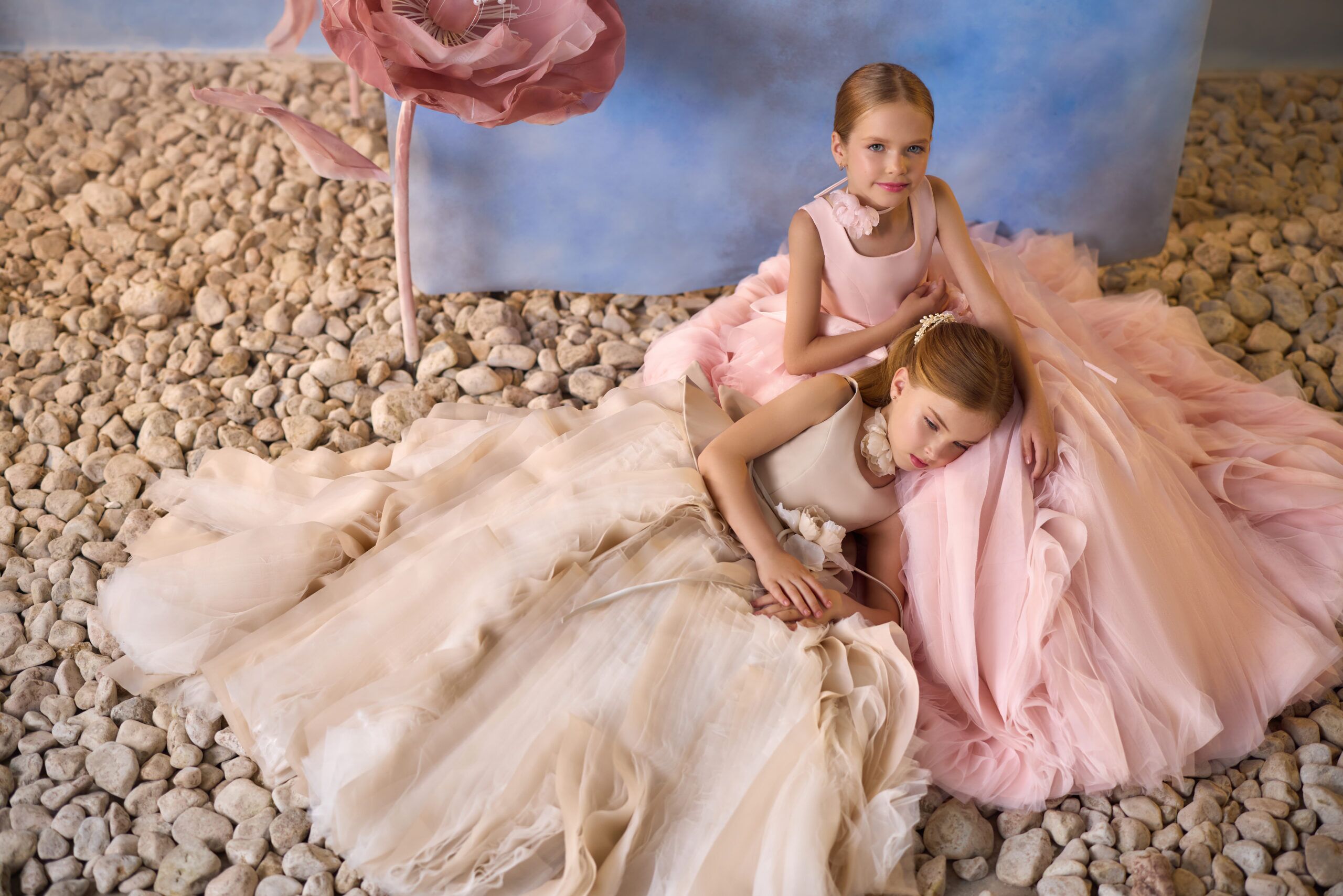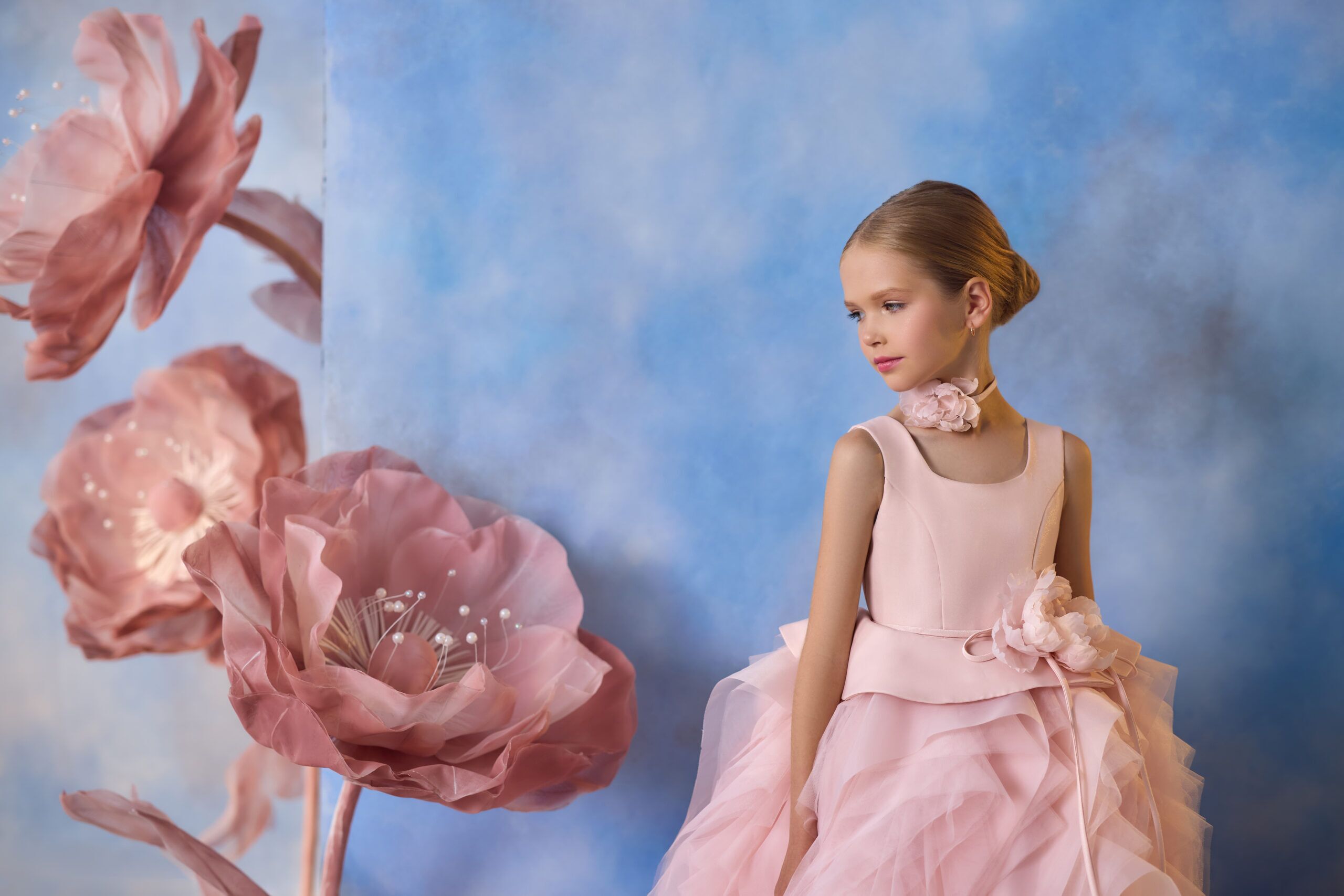 The dress with a sleeveless bodice and a layered tulle skirt, creating a voluminous and ethereal effect. It features delicate floral embellishments at the waist, enhancing its romantic and graceful design.