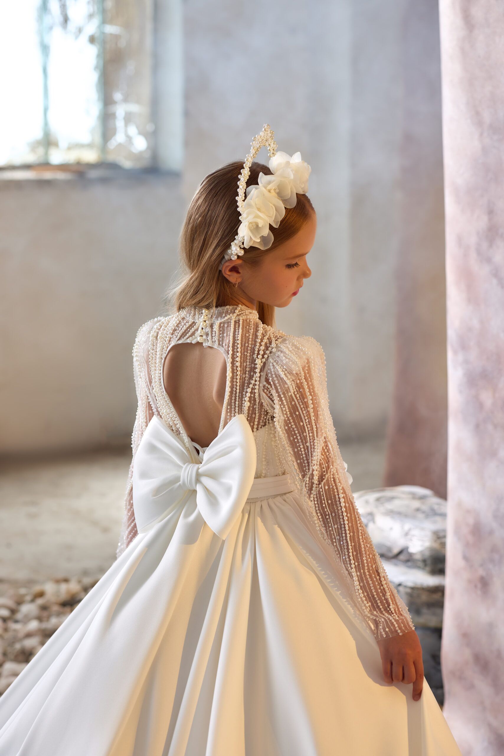 Luxurious gown featuring a fitted bodice adorned with intricate beading and a high neckline. The long, sheer sleeves add a touch of elegance, while a large floral embellishment at the waist enhances the design.