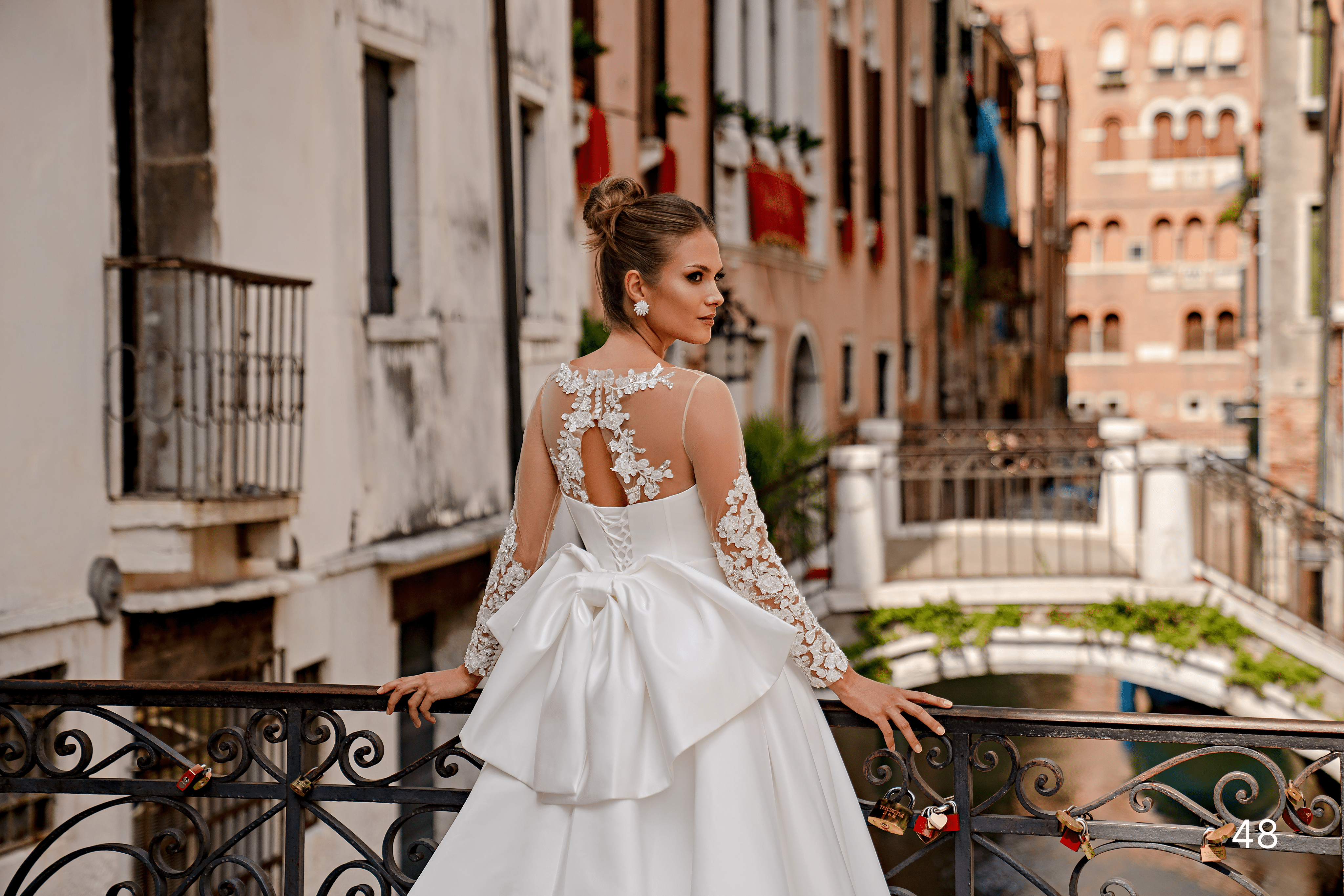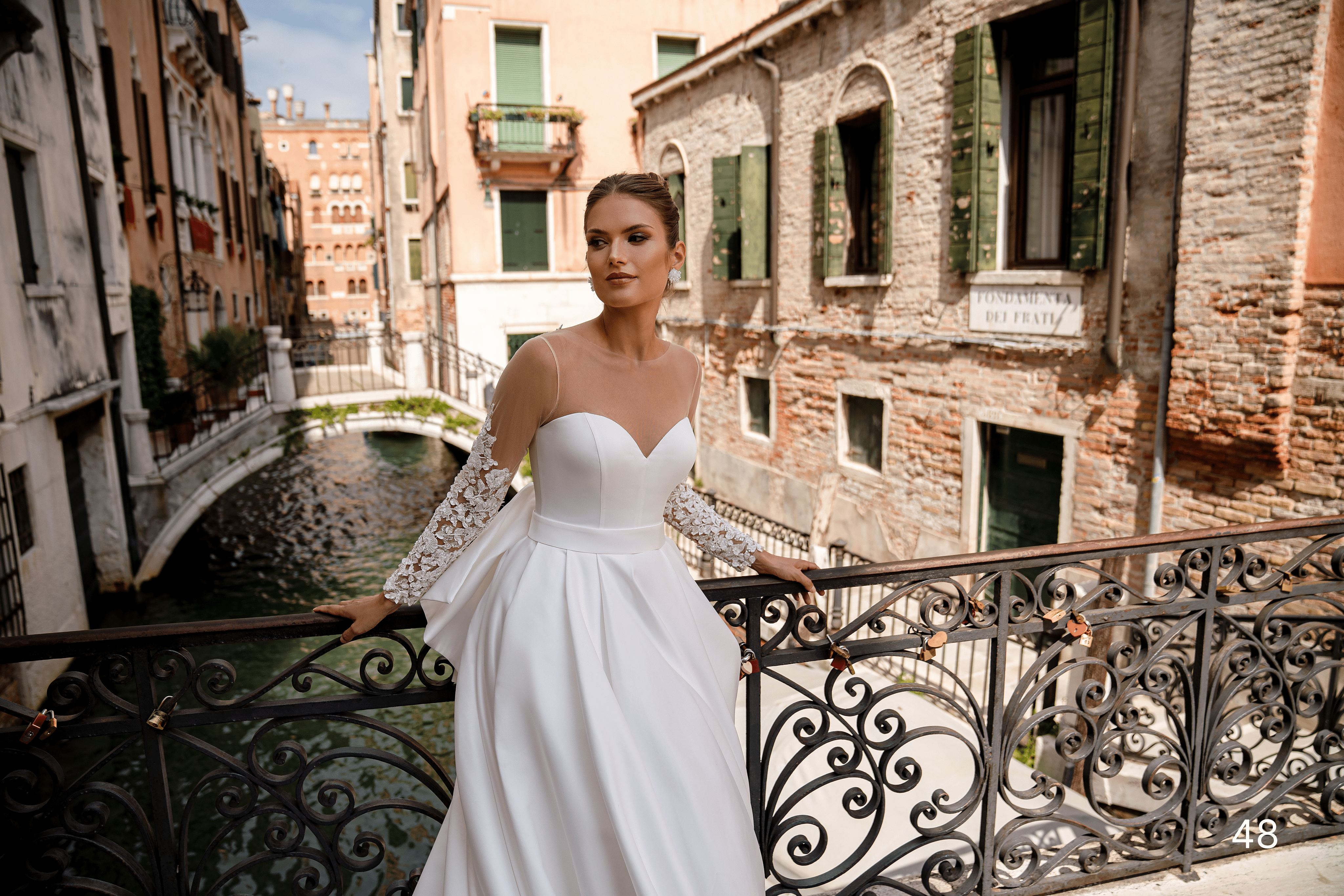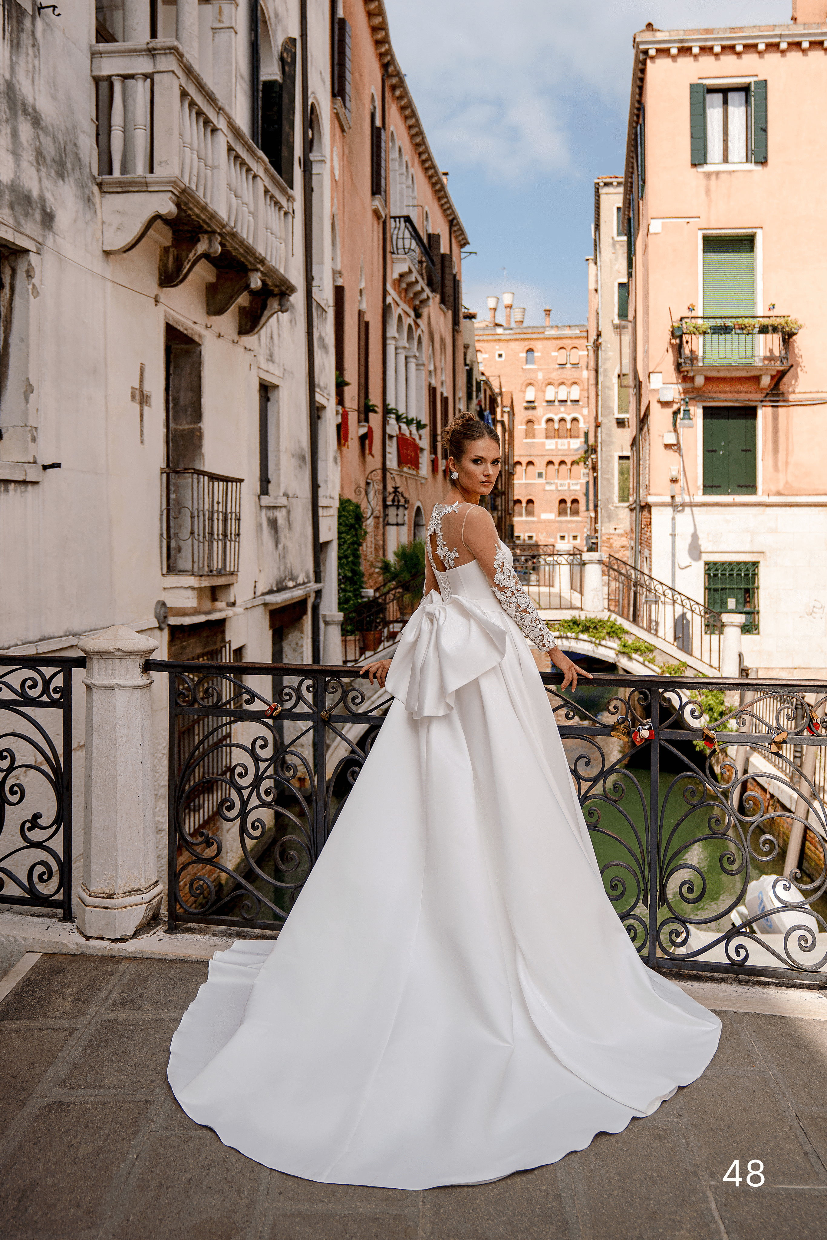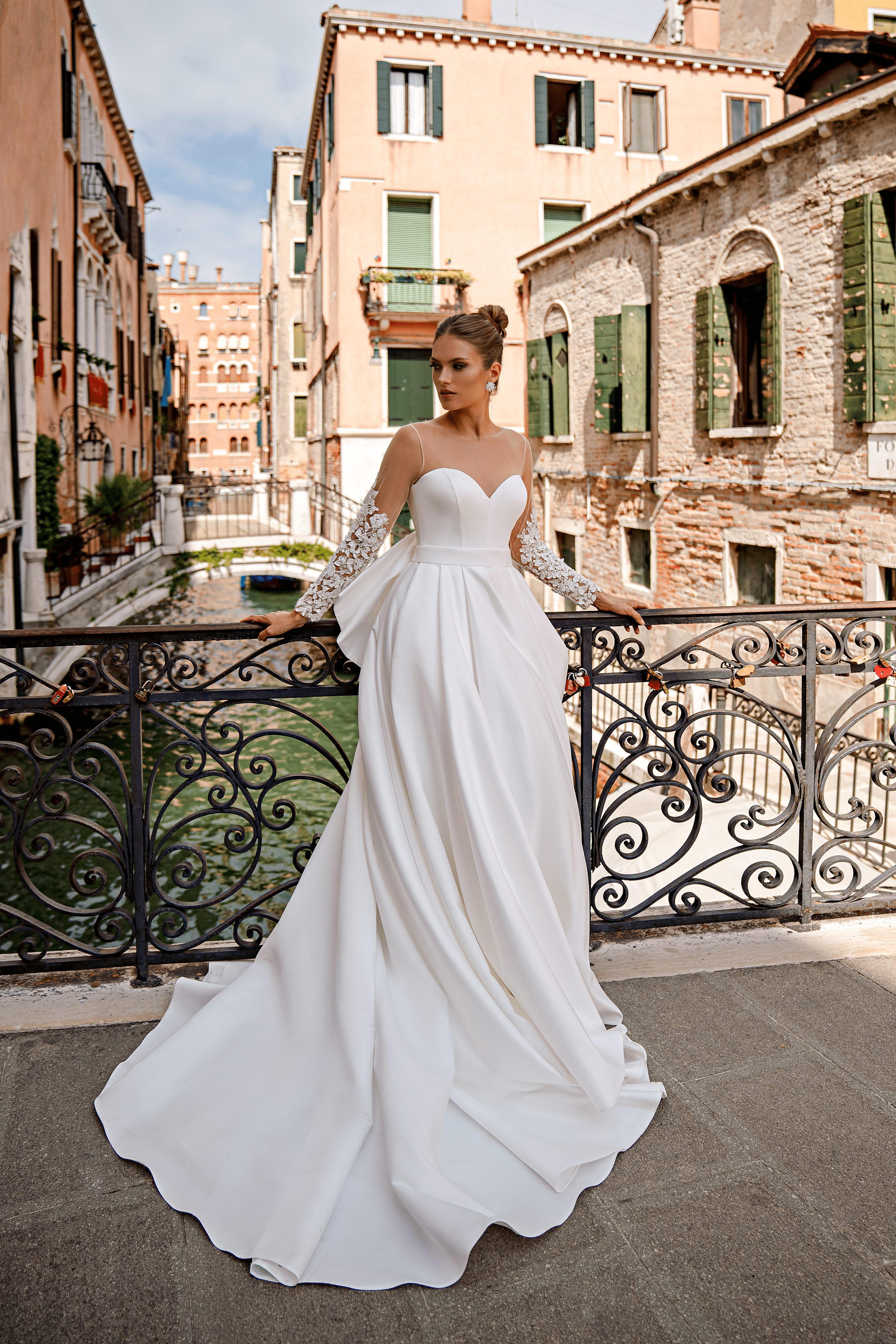 Fabulous dress made of hard rolled steel with a chic removable bow at the back. Tank top and sleeves in flesh-colored European tulle, back with a charming neckline and sleeves decorated with embroidered guipure. Skirt with pockets and train 50 cm.