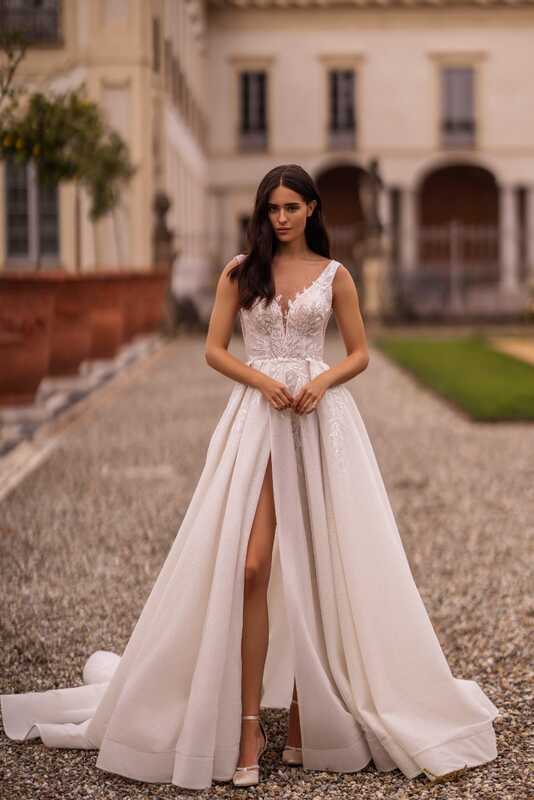 This elegant wedding dress features a fitted bodice with delicate lace detailing and a plunging neckline, complemented by thin straps. The flowing A-line skirt boasts a dramatic high slit, adding a modern and sophisticated touch to the timeless design.