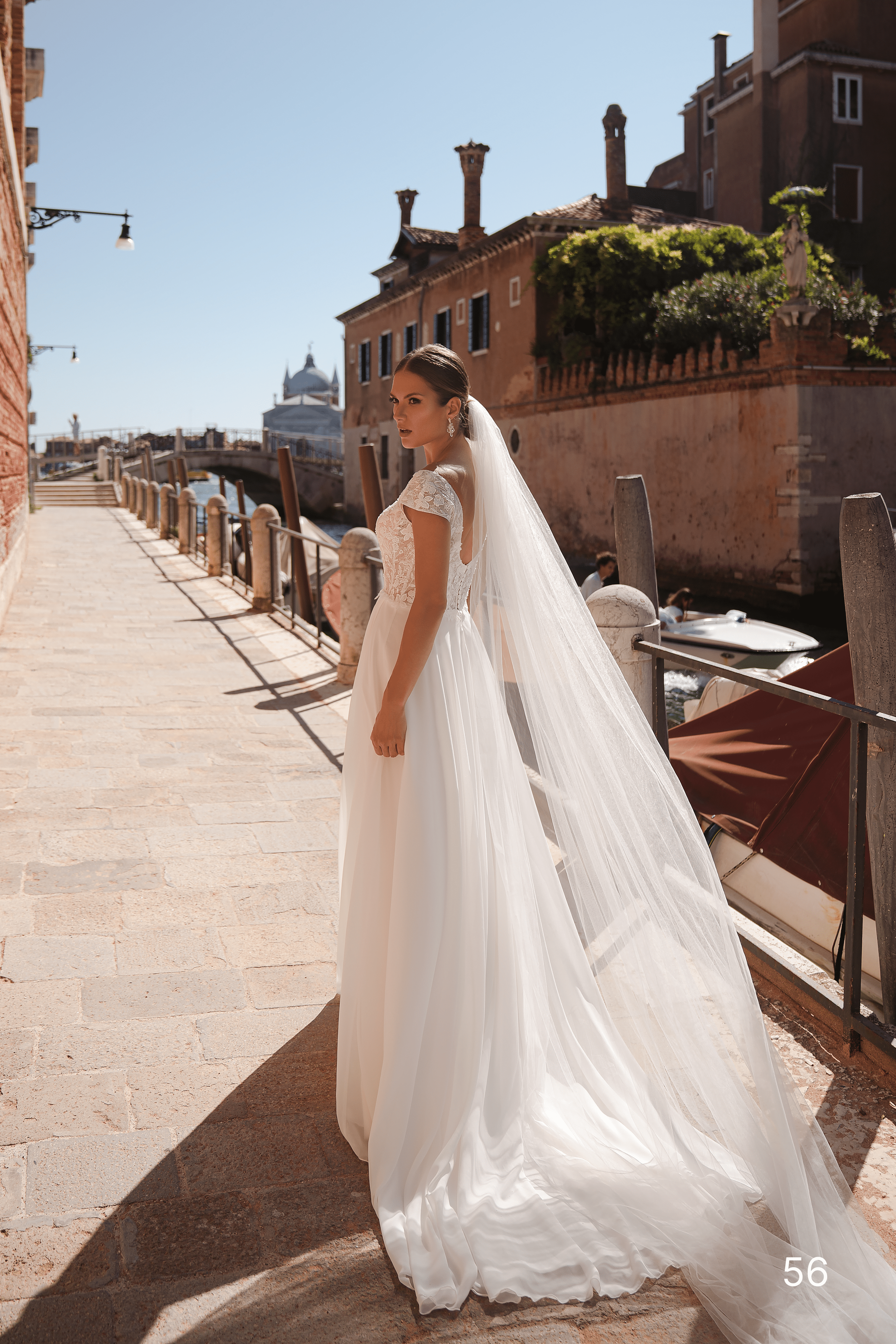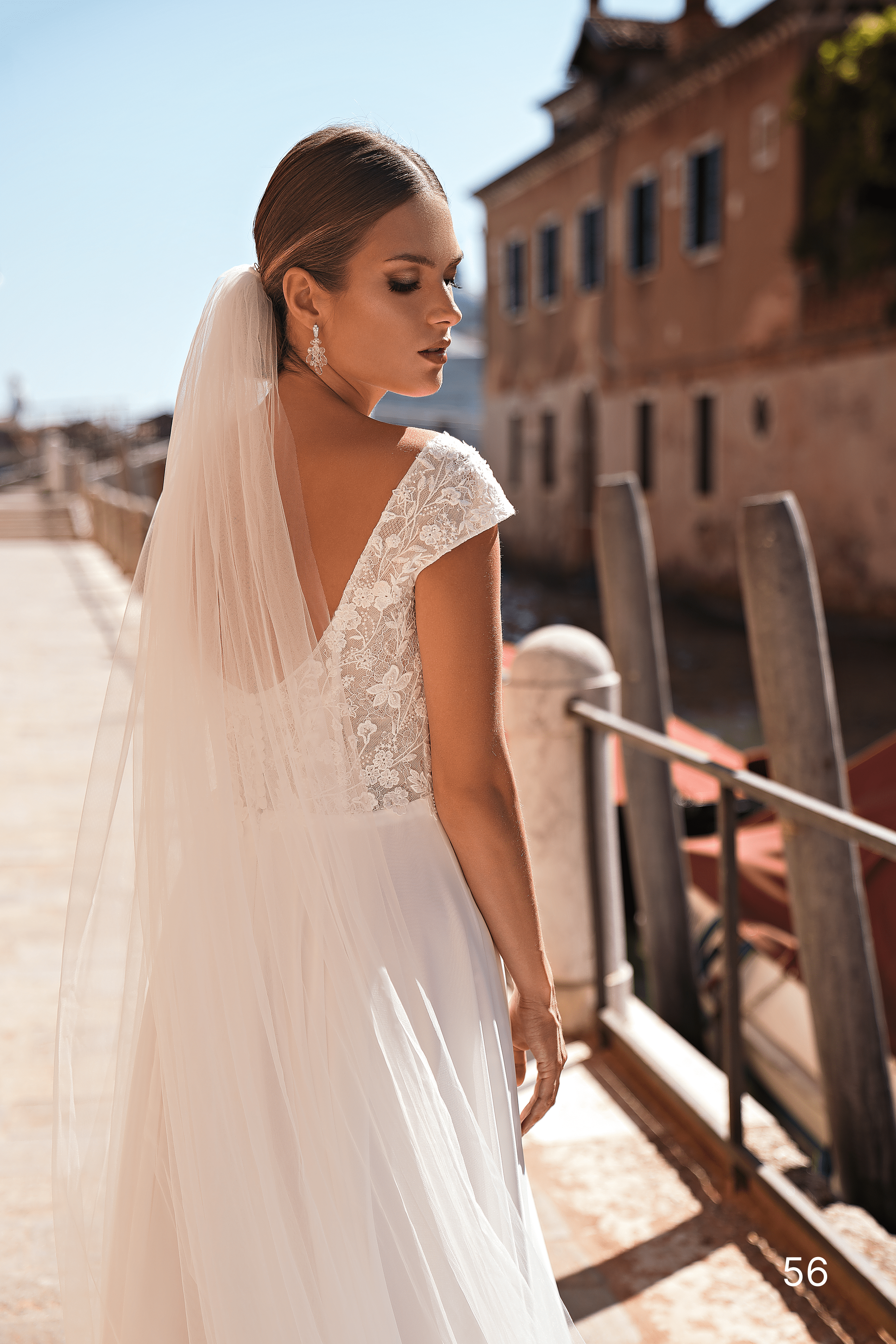 Chantilly corset decorated with embroidered guipure. Skirt made of multi-chiffon A-silhouette with a smell on the left leg. The train is 30 cm.
