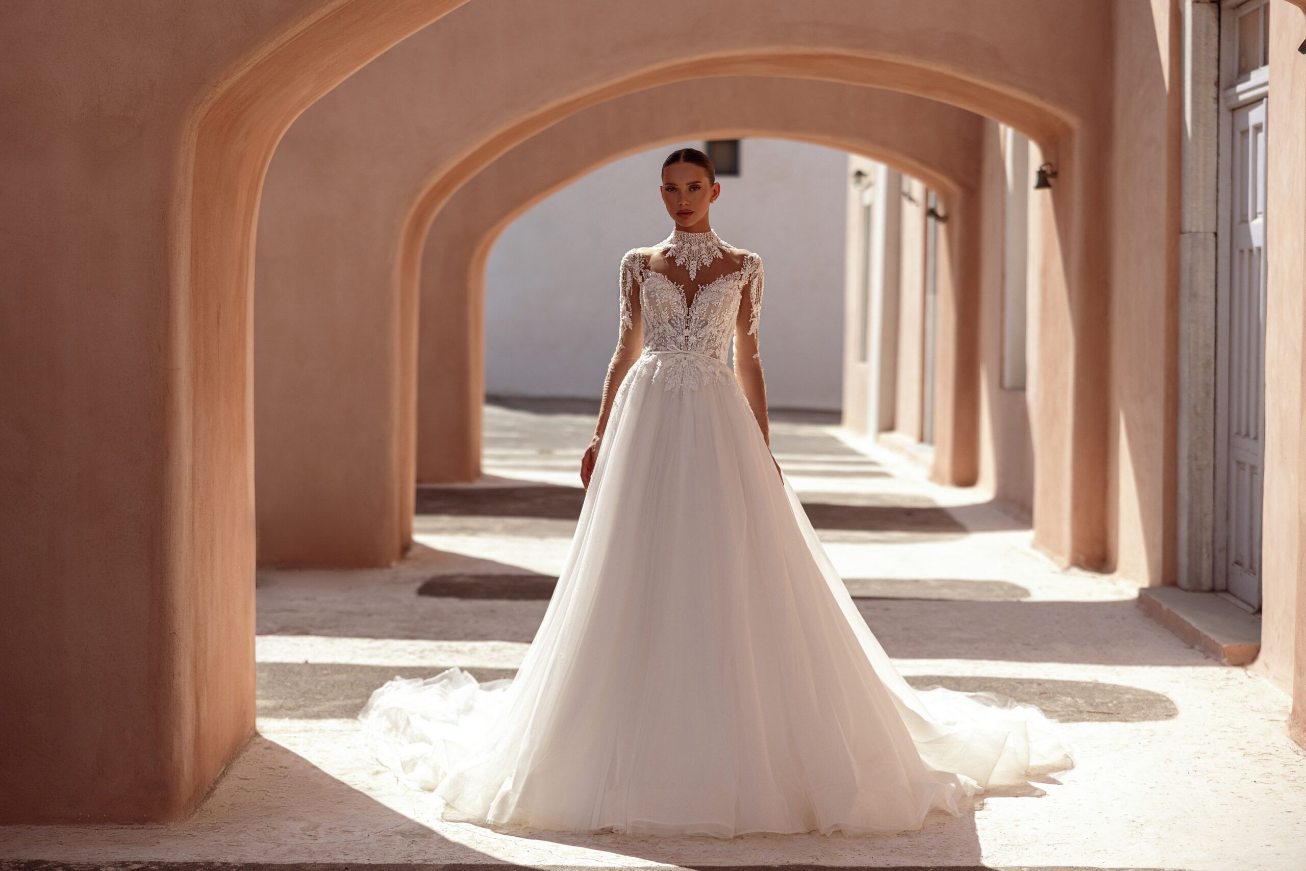 It features a high lace neckline that gracefully frames the neck, complemented by sheer long sleeves adorned with intricate lace details. The fitted bodice is decorated with delicate embroidery, creating a stunning contrast against the soft, voluminous tulle skirt that cascades into a dreamy, floor-length train. The color of the dress is ayvory.