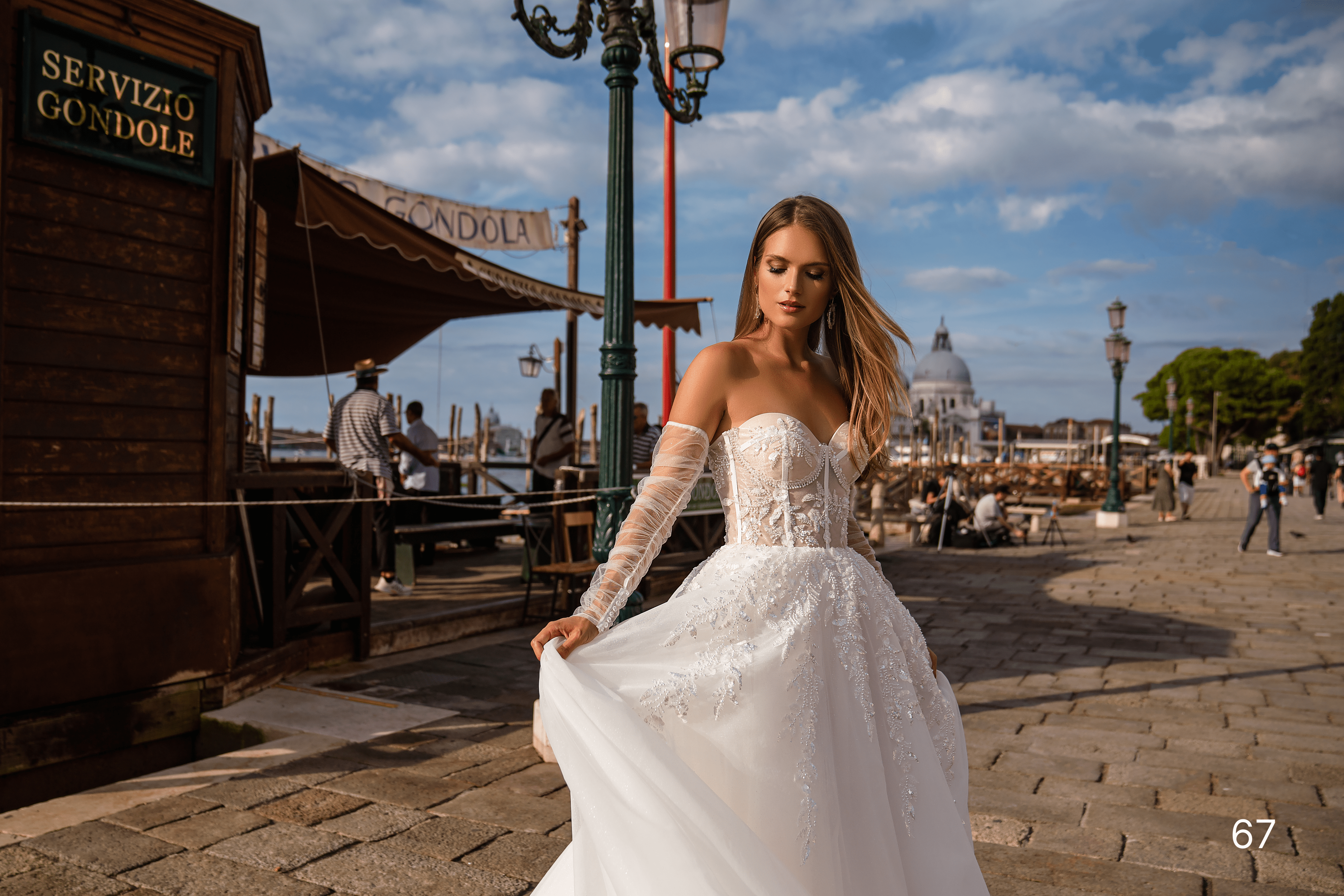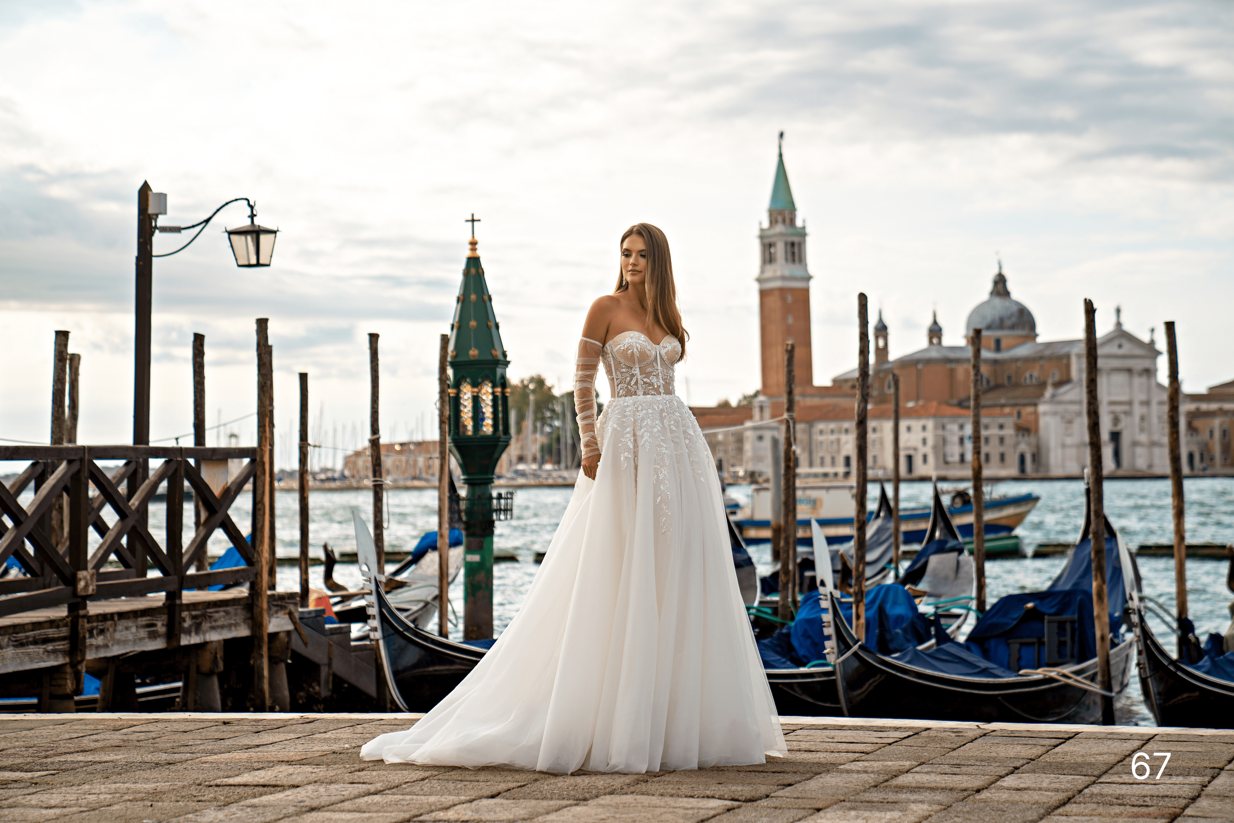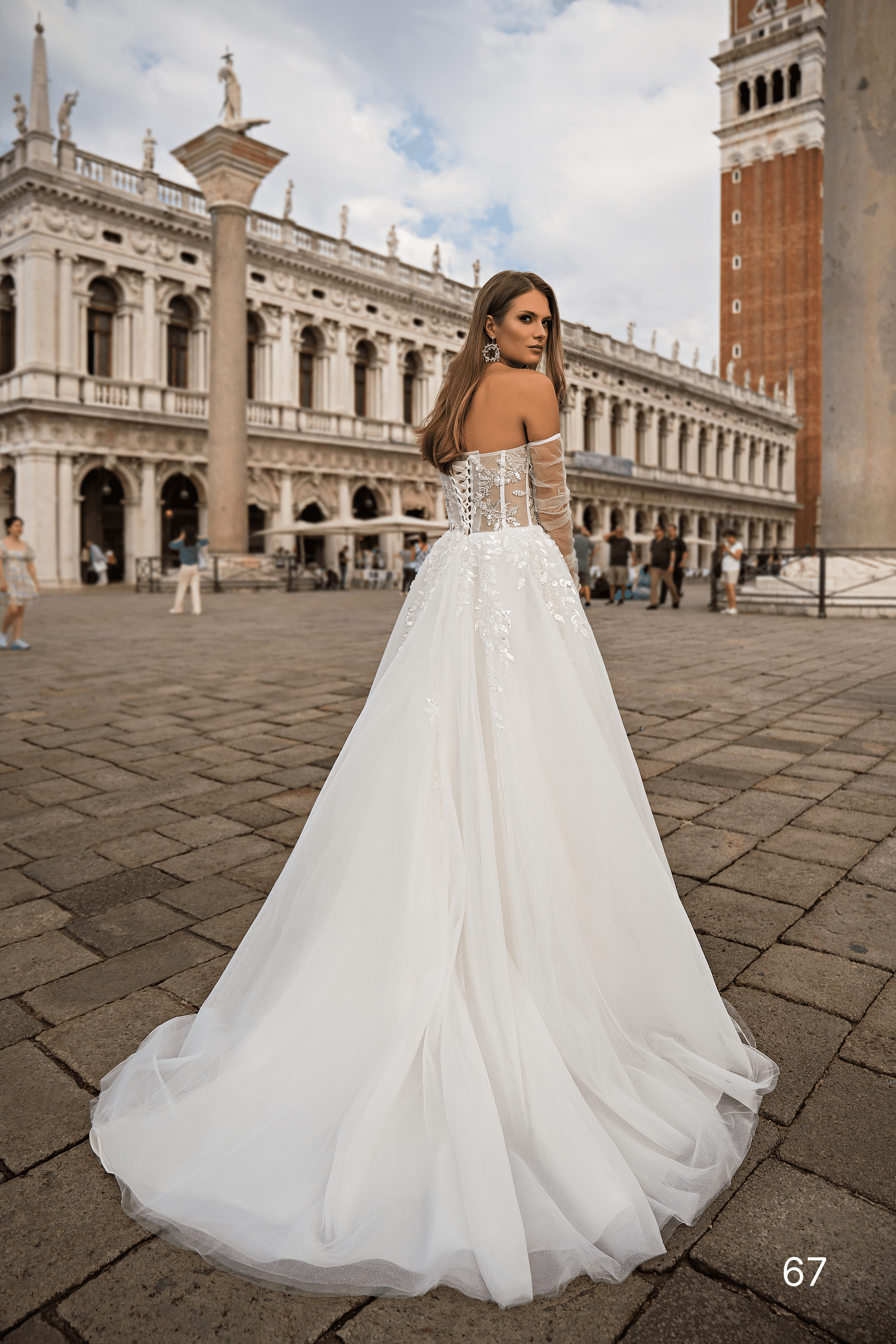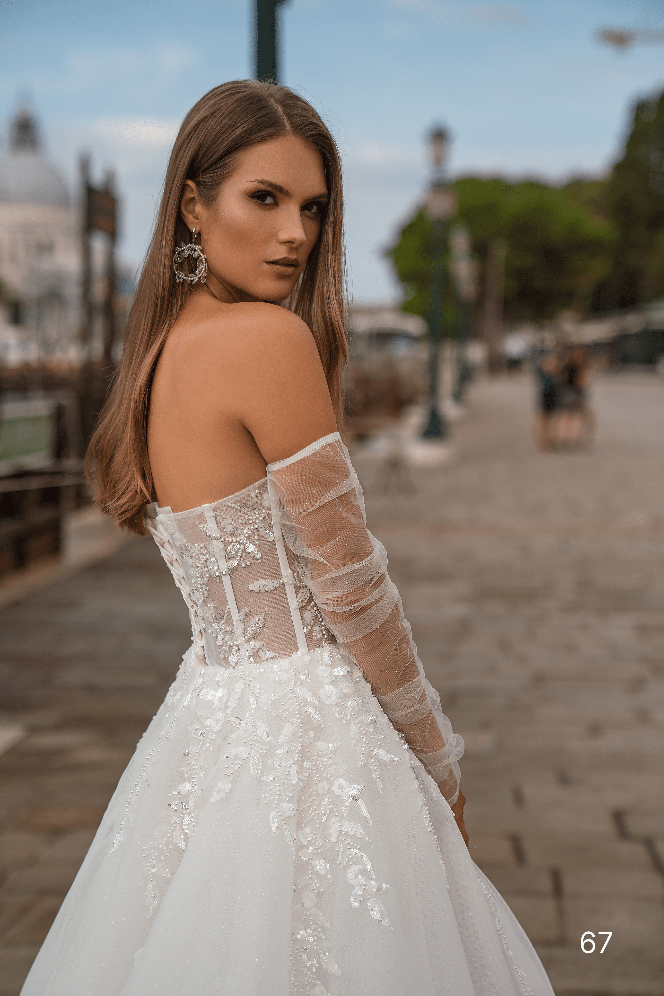 A corset, decorated with chic embroidered guipure, which smoothly falls on an A-silhouette skirt, which is made of expensive European tulle; under 1 row there is a shine; plume 30 cm.