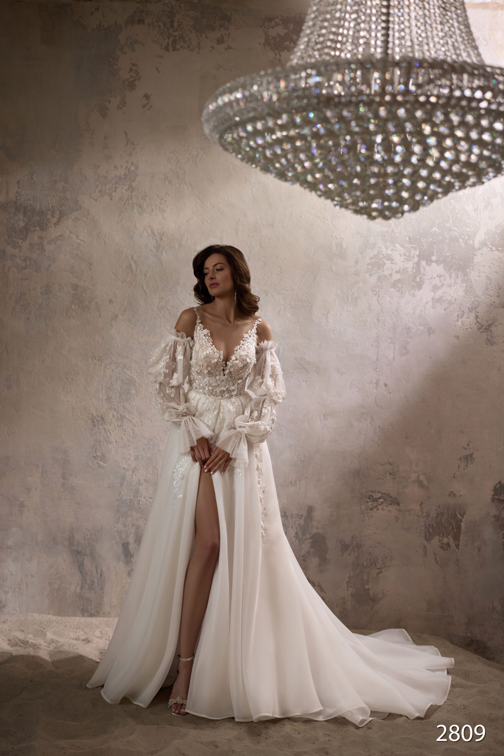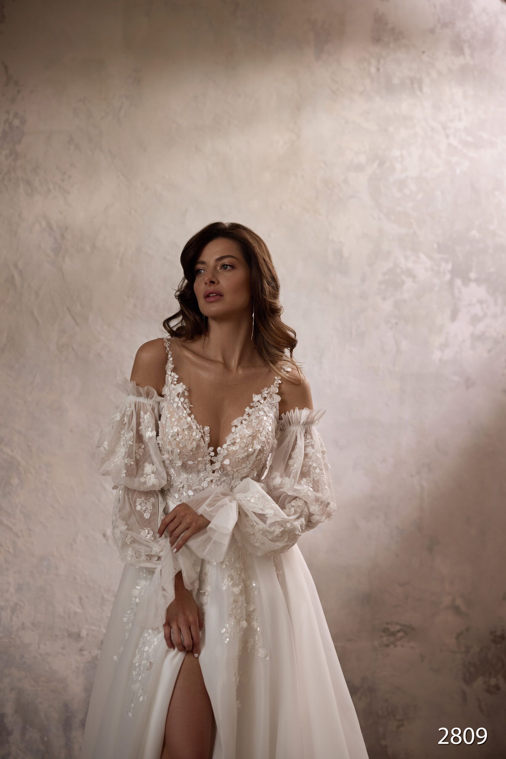 A dreamy wedding gown featuring a fitted bodice with intricate floral appliqués and a deep neckline, paired with voluminous, detachable bishop sleeves that add a touch of vintage romance. The flowing skirt with a daring high slit creates an alluring yet elegant silhouette. Perfect for a bride who seeks a balance of timeless grace and modern allure.