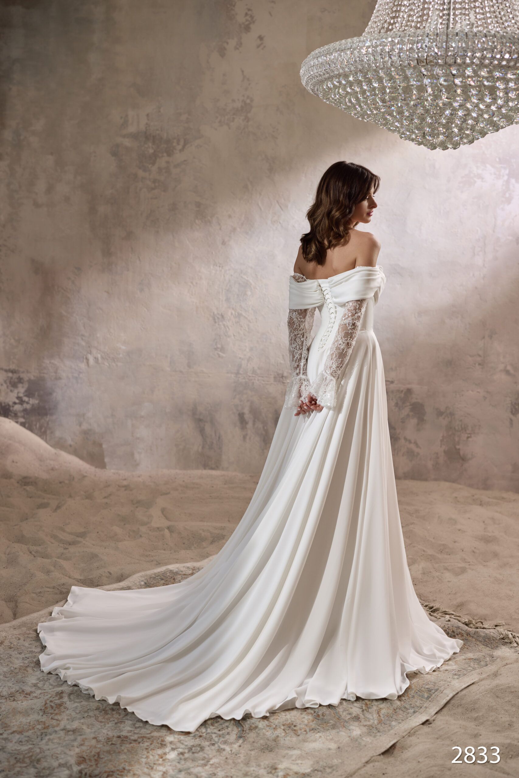 An enchanting off-shoulder wedding dress with delicate lace sleeves, a draped bodice, and a flowing skirt. The perfect blend of classic elegance and modern charm.